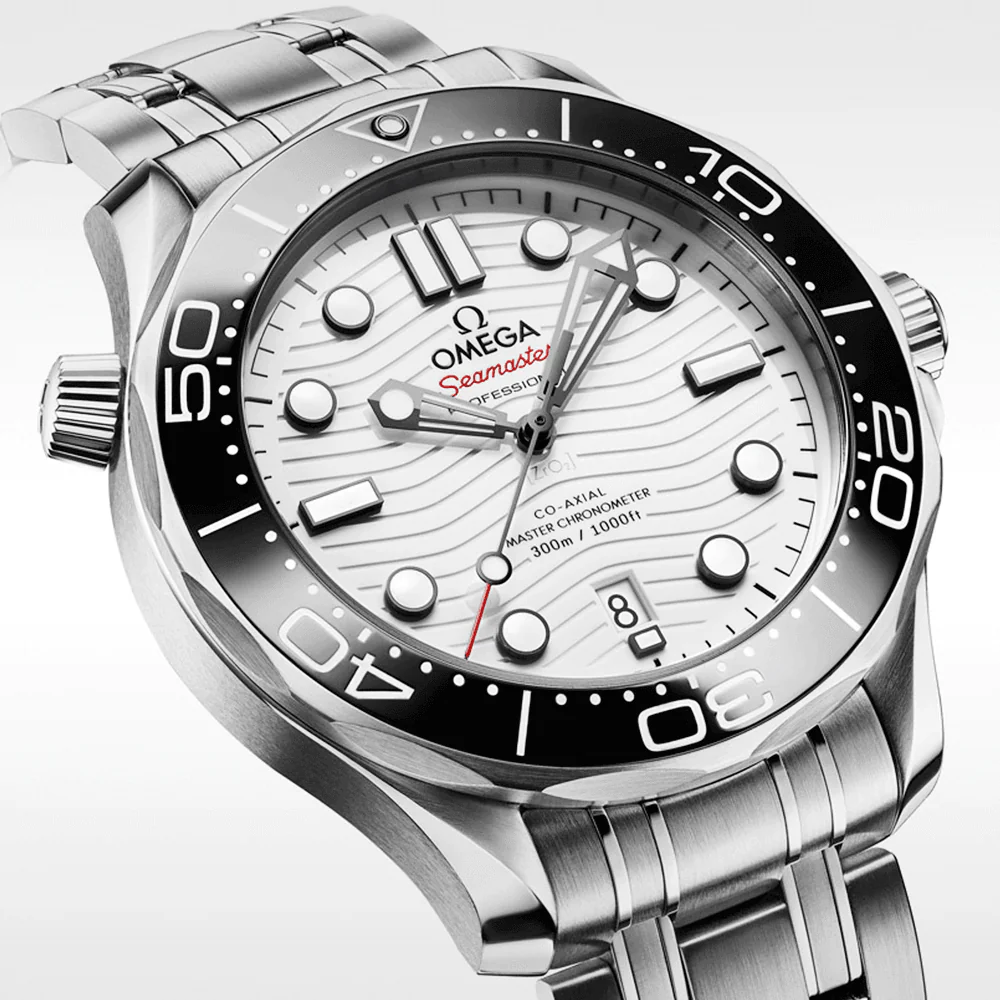 Having enjoyed a legendary following since it first launched in 2005, the Omega Seamaster Professional Diver 300M watch extends the popular line with this 42mm stainless steel model. Presenting the time on a polished white ceramic dial with polished and brushed laser-ablated wave effect pattern – the watch Features Super-LumiNova filled hands and indexes as well as a red-tipped central sweeping second hand. A date feature can also be referenced at 6 o’clock. Protecting this dial is an anti reflective lens crafted from sapphire crystal glass. A black ceramic unidirectional rotating bezel is easy to handle under wet gloves and enables the diver to measure elapsed time underwater effortlessly by aligning it with the minute hand on the dial. This men’s 42mm Omega Seamaster Diver 300M watch is 300-meter water resistant and Features a screw-down crown, a helium escape valve and a sapphire glass caseback for admiring the performance of the Omega Master Chronometer Calibre 8800 at work. This engine provides a 55-hour power reserve. The watch is completed on a brushed and polished stainless steel bracelet with a folding clasp for a secure fit.
