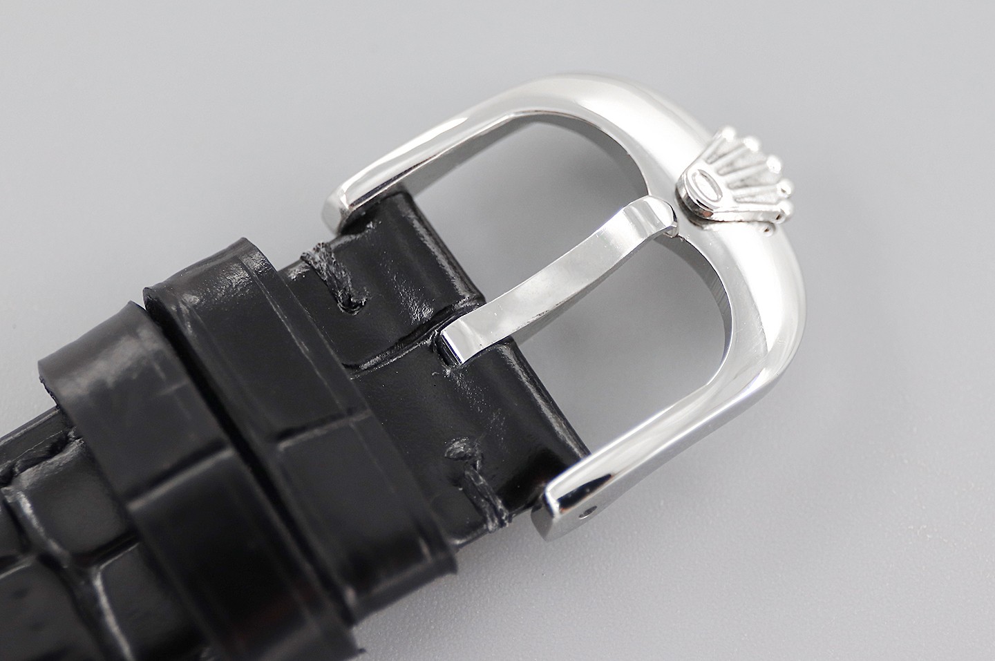 Rolex Cellini Date 50519 Black Leather Black Dial 39mm Mens Replica Watch has a white Gold 39 mm Round Case with Screw Down Crown and a White Gold Bezel.Scratch resistant sapphire crystal.Black sunburst guilloche dial with raised polished baton hour markers. Fine printed minute/seconds track. Date subdial at 3 o''clock aperture. Black Leather Bracelet will look great on your wrist with white gold tang buckle.