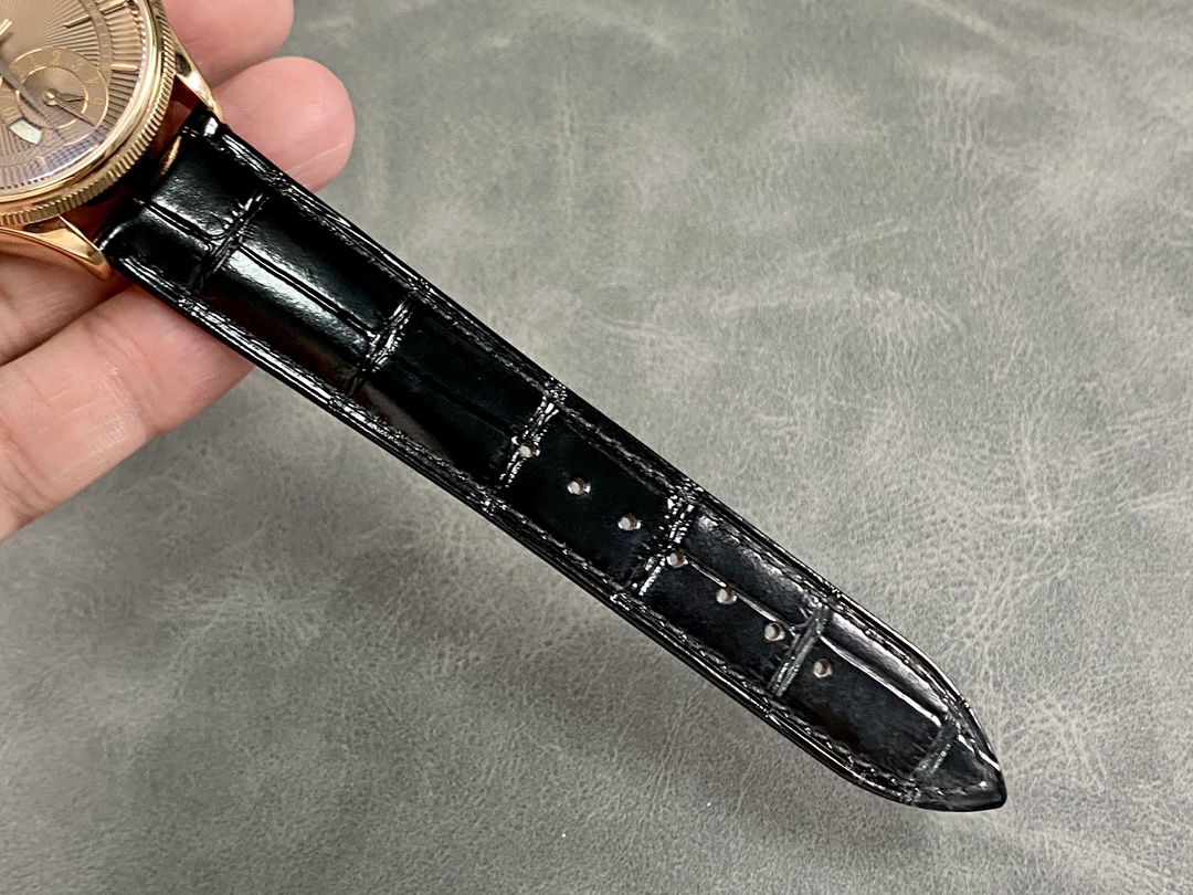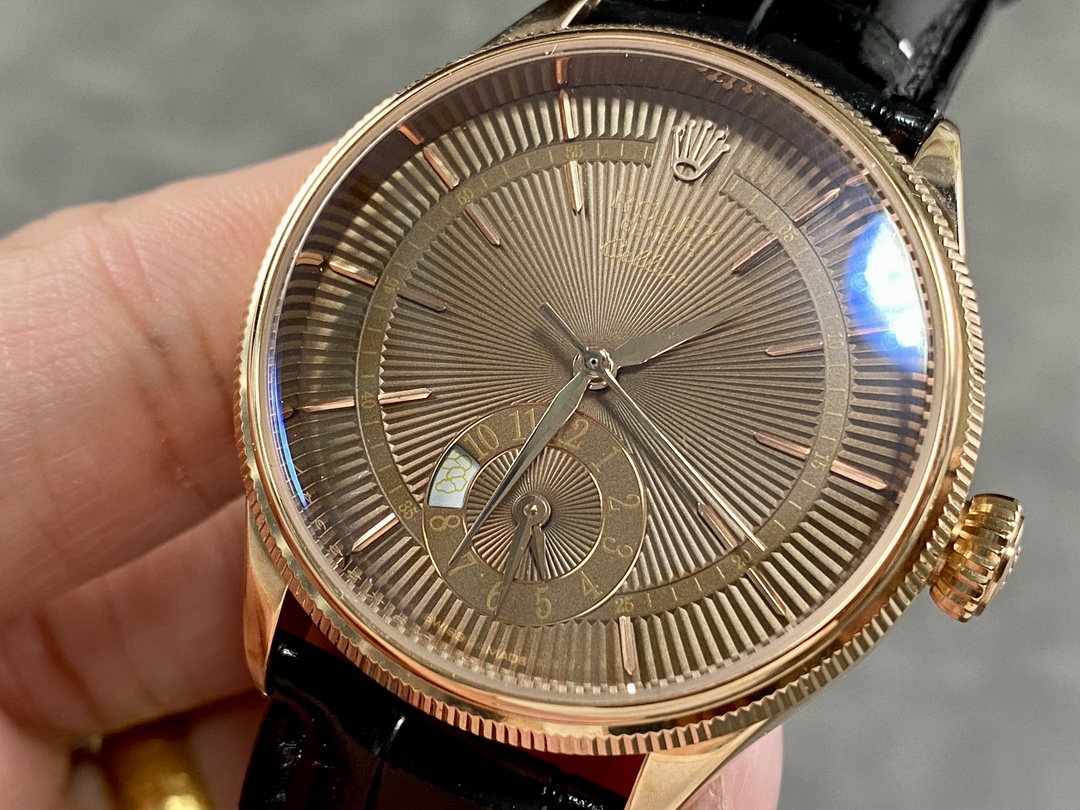 Rolex Cellini Dual Time 50525 Brown Guilloche Dial Black Leather Strap 39mm Mens Replica Watch
