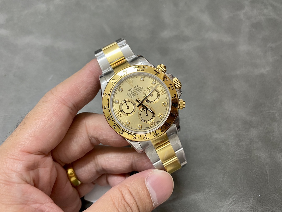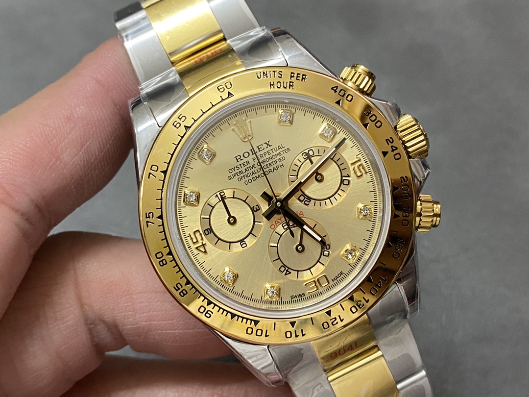 Rolex Cosmograph Daytona 116503 Yellow Gold Champagne Diamond Dial 40MM Mens Replica Watch,40MM Yellow Gold And Stainless Steel case,Screw Down crown. Scratch Resistant Sapphire crystal.Champagne dial With 8 diamond hour markers,30-minute counter at 3 o'clock, and 12-hour counter at 9 o'clock,Stainless steel and yellow gold oyster bracelet with flip-lock clasp.