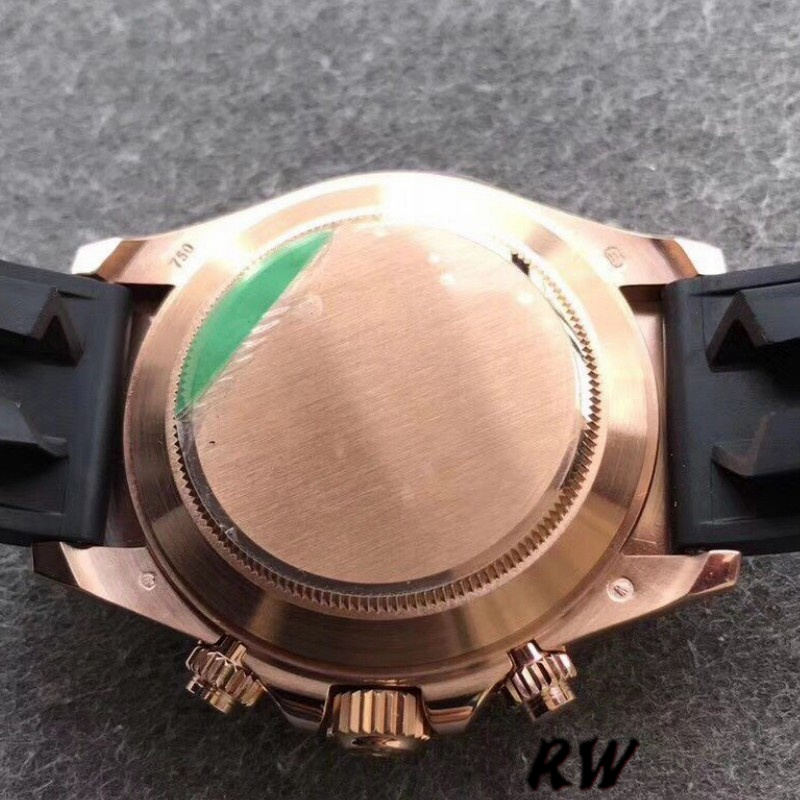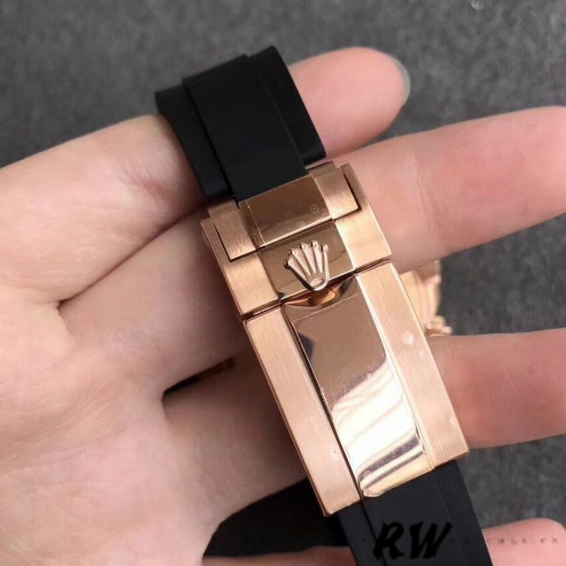 Rolex Cosmograph Daytona 116515 Chocolate Brown Dial 40mm Mens Replica Watch.40mm Everose gold case with brushed and polished finished center lugs.features chocolate dial with Arabic numerals. Black ceramic bezel. Comes on black leather strap with rose gold deployant buckle. Black "Cerachrom" bezel, made of highly durable ceramic that is extremely hard, highly scratch-resistant, has excellent corrosion resistant properties is unaffected by ultraviolet rays so the color will not fade.