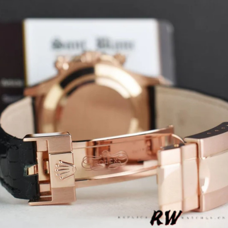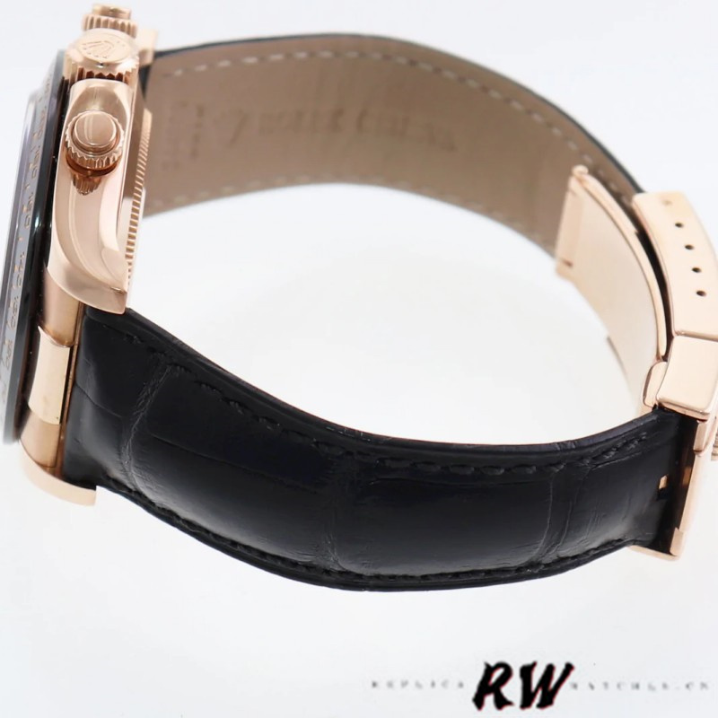 Rolex Cosmograph Daytona 116515 Leather strap Black Dial 40mm Mens Replica Watch.40mm rose gold case. Ceramic black bezel with tachymetric scale. This elegant rose gold chronograph features a black dial with contrasting typeface and 'ringed' guilloché sub-dials, Chromalight hands and hour markers, and a scratch-proof black Cerachrom tachymetric bezel. Black rubber Oysterflex strap with fold over clasp with safety.