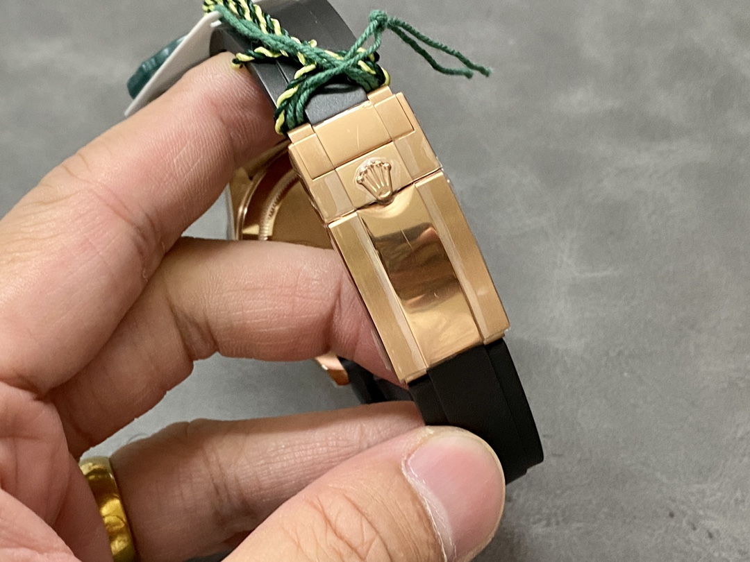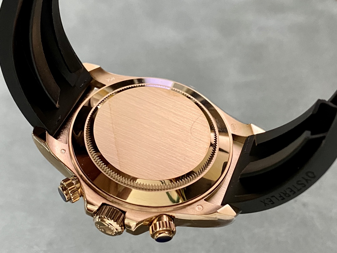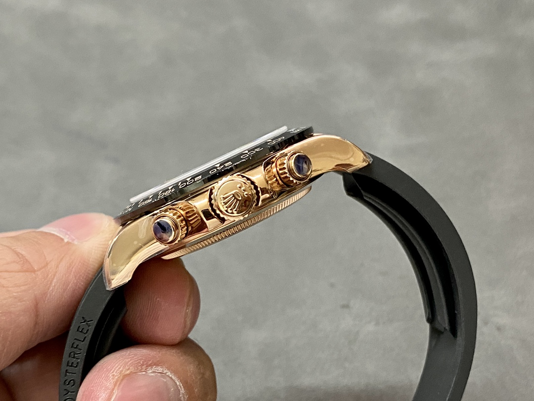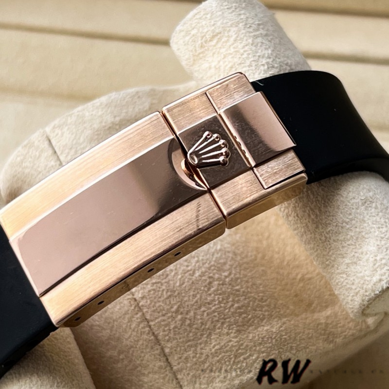 Rolex Cosmograph Daytona 116515LN Everose Gold Ivory Dial 40mm Mens Replica Watch. 40mm Everose gold case, screw-down Everose back, screw-down crown and push buttons with Triplock triple waterproofness, black monobloc Cerachrom bezel with engraved tachymetric scale, scratch-resistant double anti-reflective sapphire crystal, ivory colored dial, index hour markers, Chronograph central second hand, 30-minute counter at 3 o'clock, and 12-hour counter at 9 o'clock. blades overmoulded with high-performance elastomer, Oysterlock folding safety buckle with Easylink rapid extension system.