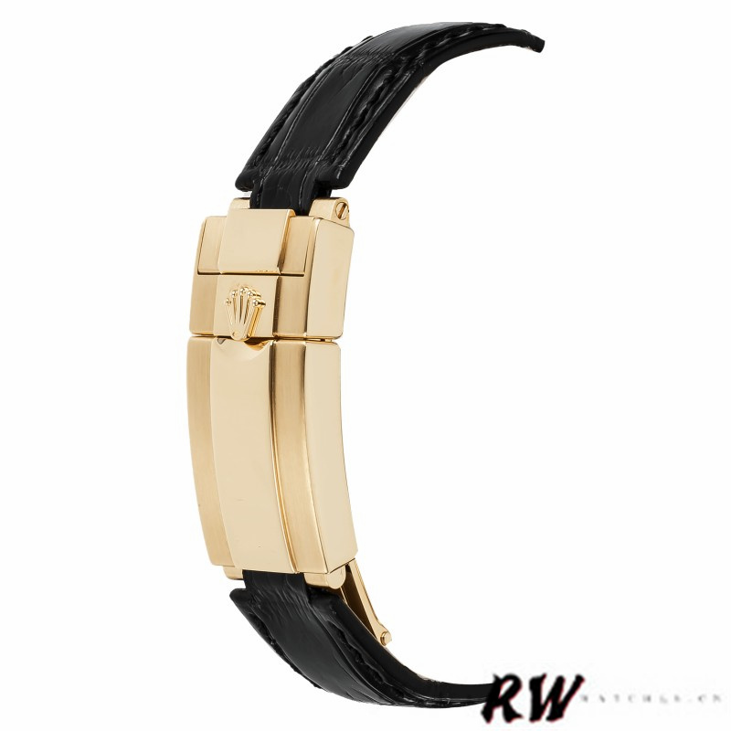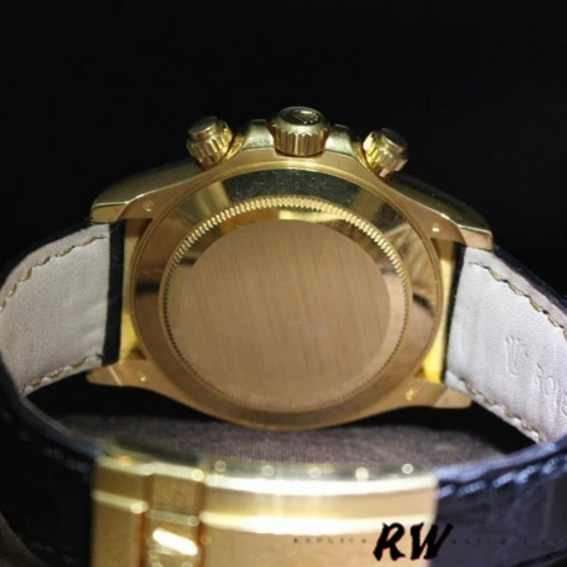 Rolex Cosmograph Daytona 116518 Black And Champagne Dial 40mm Mens Replica Watch.40mm yellow gold case, screw-down yellow gold back, screw-down crown and push buttons.Black monobloc Cerachrom bezel with engraved tachymetric scale, scratch-resistant double anti-reflective sapphire crystal, black dial with champagne subdials, index hour markers, Chronograph central second hand, 30-minute counter at 3 o'clock, and 12-hour counter at 9 o'clock. Black Leather strap made from flexible metal blades overmoulded with high-performance elastomer, Folding safety buckle with rapid extension system.