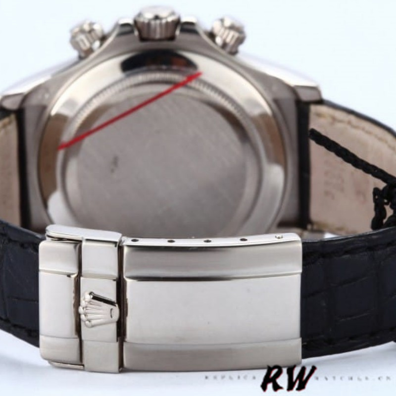Rolex Cosmograph Daytona 116519 Gray dial Black Leather Strap 40mm Mens Replica Watch. The 40mm white gold case Rolex watch has a Triplock winding crown and two screw-down chronograph pushbuttons.Fixed domed tachymeter bezel and a scratch-resistant sapphire crystal.For the fans of leathered watches, this racing Daytona has a black embossed crocodile strap with a folding Oysterlock safety clasp for a perfect fit.