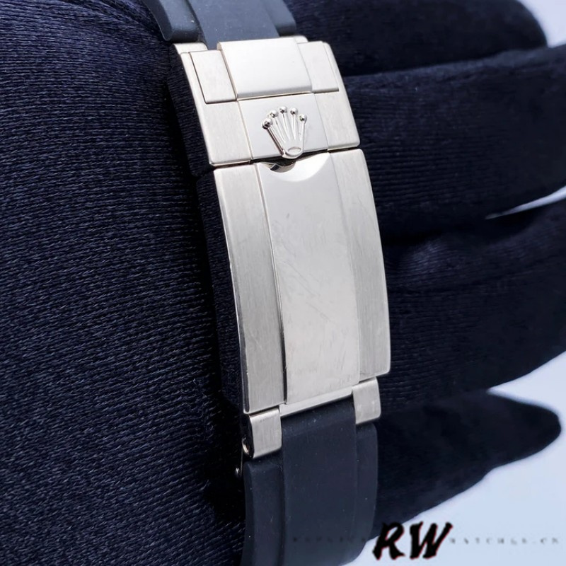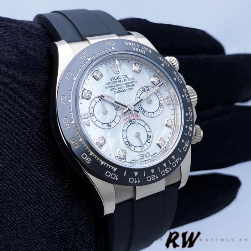 Rolex Cosmograph Daytona 116519 Mother of Pearl Dial 40mm Mens Replica Watch.40mm white gold case. Ceramic tachymeter bezel with black plexiglas insert.The beautiful dial is made with mother-of-pearl and set with diamonds to give a reflective outlook. Three separate sub-dials contained within the center dial with 60 seconds, 30 minutes, and a 12-hour indication are also included.Black rubber Oysterflex strap with fold over clasp with safety. Will fit up to 6-Inch wrist.