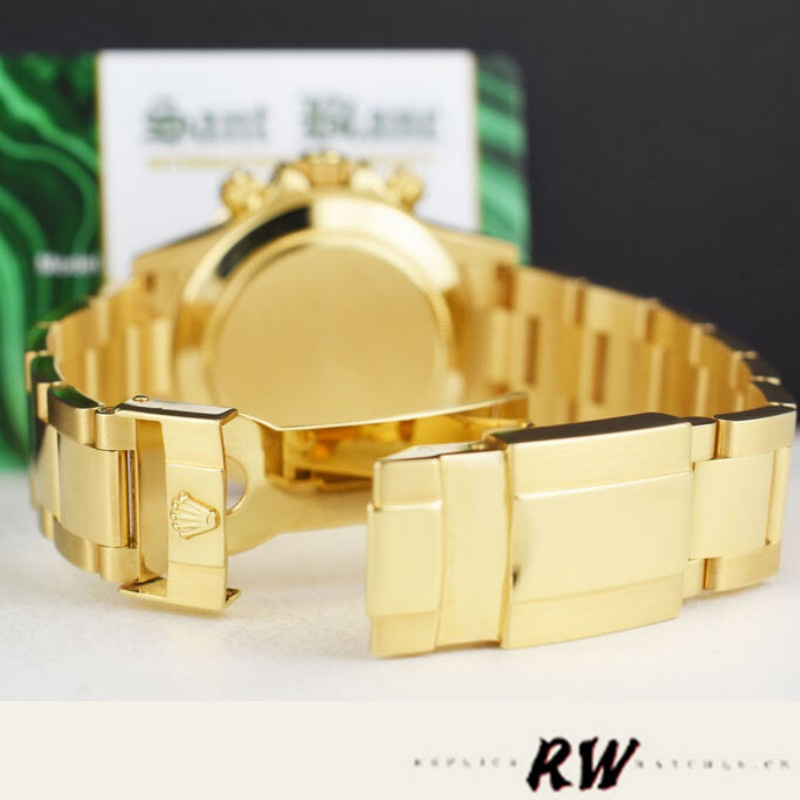 Rolex Cosmograph Daytona 116528 Black MOP Diamond Dial 40MM Mens Replica Watch,40mm yellow gold case in diameter. Yellow gold tachymeter engraved bezel. Scratch resistant sapphire crystal. Black Mother of Pearl Dial with Diamond Hour Markers.Outer 1/5th seconds track. Three Gold outlined subsidiary dials for the seconds, the 12-hour and 30-minute registers. Luminous yellow gold baton hands.Yellow gold oyster bracelet with flip-lock clasp.