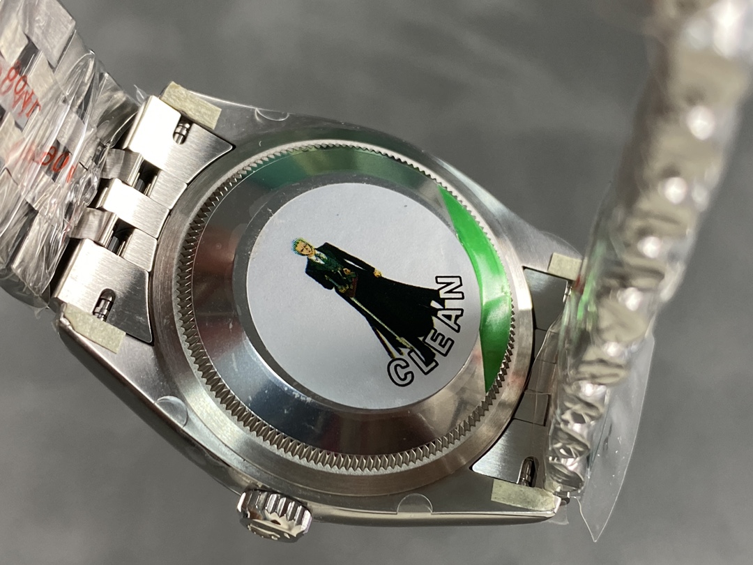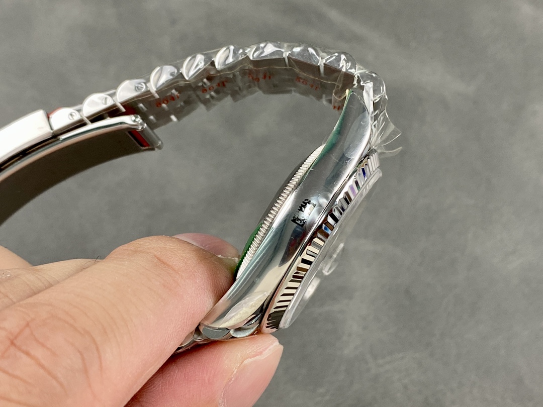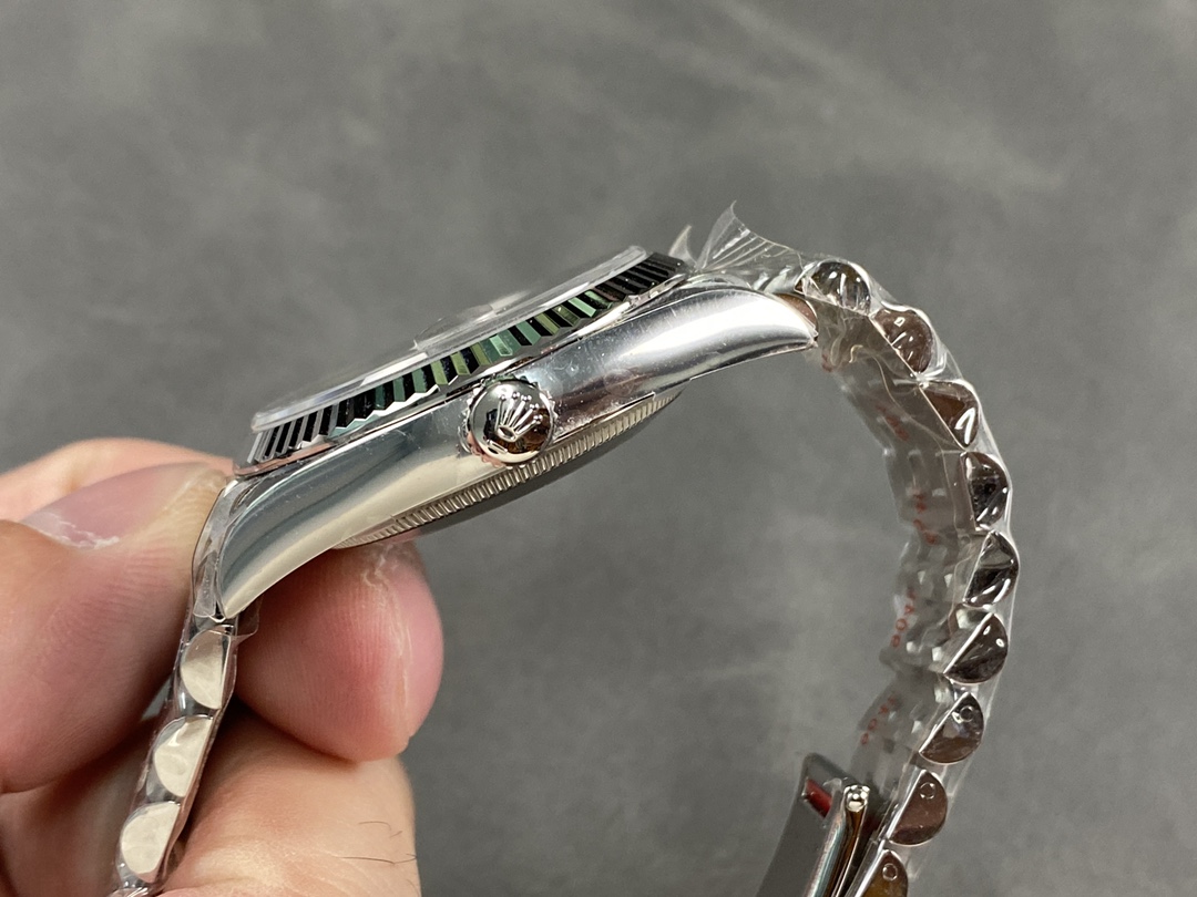 Rolex Datejust 126234 Slate Grey Wimbledon Dial 36MM Unisex Replica Watch features a 36mm stainless steel case, Polished solid white gold fluted fixed bezel ,Grey Wimbledon dial with green roman numerals.Date window displayed under cyclops lens at 3 o'clock with instantaneous date setting.Jubilee bracelet with five-piece links, folding Oysterclasp buckle with Easylink comfort extension link.