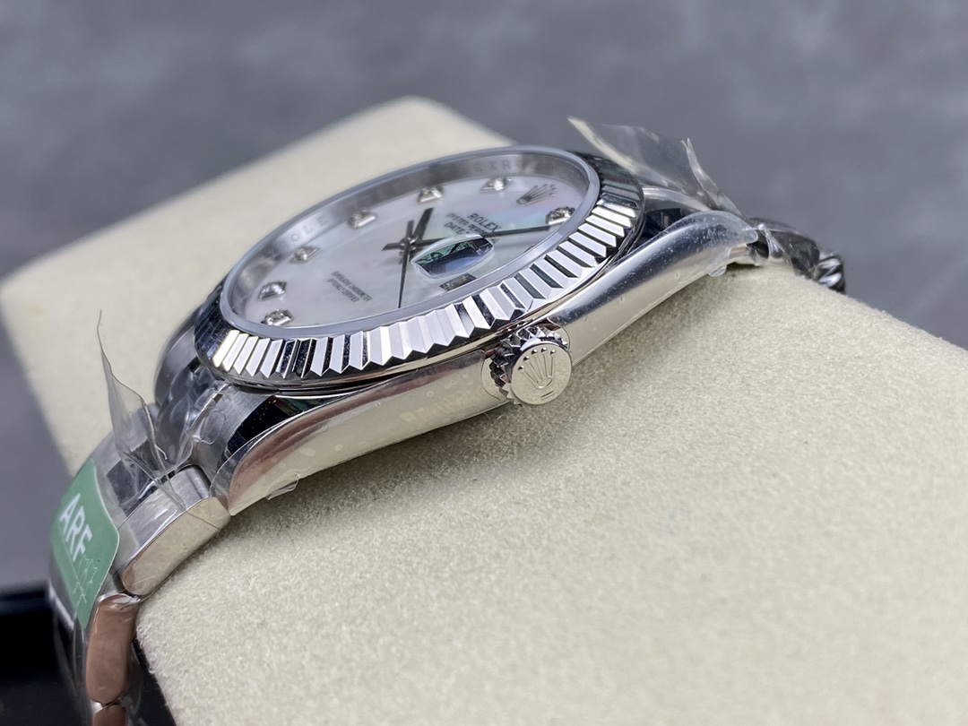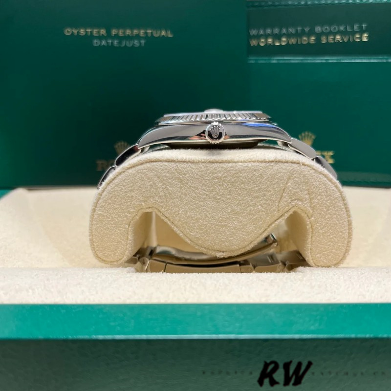 Rolex Datejust 126334 Fluted Bezel White MOP Dial 41MM Mens Replica Watch features 41mm a polished Oystersteel stainless steel case, Polished solid white gold fixed fluted bezel. Mother of pearl white dial with diamond hour markers.Date displayed under cyclops lens in window at 3 o'clock with instantaneous date setting. Stop-seconds feature for precise time setting. A scratch resistant sapphire crystal protects the dial.Polished with brushed Oystersteel stainless steel Jubilee bracelet.Folding Oysterclasp deployment buckle with Easylink comfort extension link.