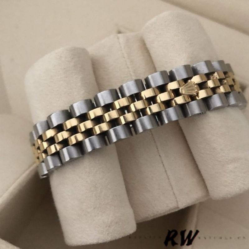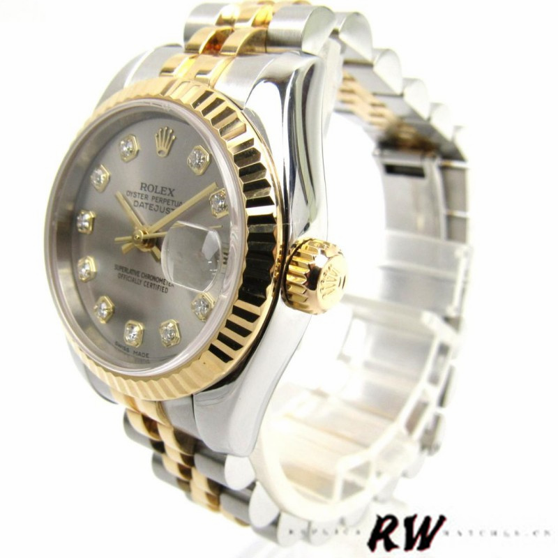 Rolex Datejust 179173 Gray Diamond Dial Fluted Bezel 26MM Lady Replica Watch,Stainless steel oyster case 26.0 mm in diameter.Yellow gold fluted bezel. Scratch resistant sapphire crystal with cyclops magnifier.Gray Diamond Dial with Diamond Hour Markers.Date calendar at 3 o'clock aperture. Stainless steel yellow gold jubilee bracelet with a hidden clasp.