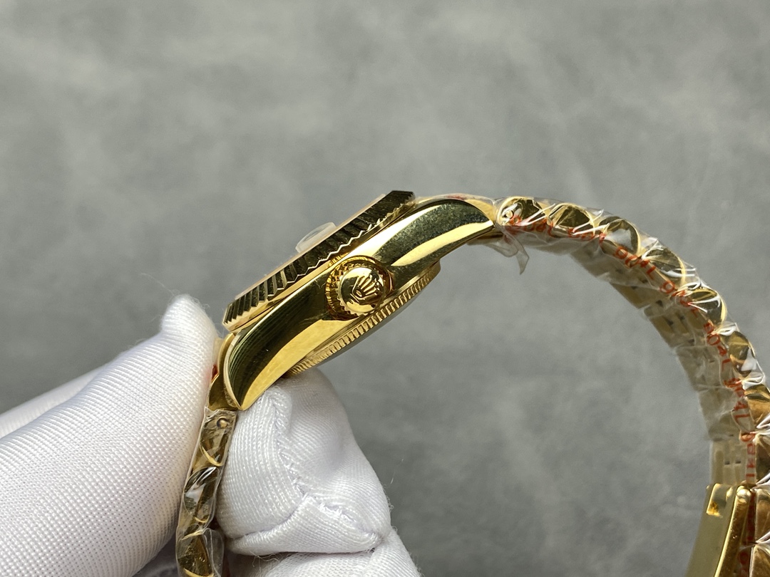 Rolex Datejust 279178 Champagne Diamond Dial Fluted Bezel 28mm Lady Replica Watch, has a yellow gold 28 mm Round Case with Screw Down Crown and a yellow gold Fluted Bezel.Champagne dial with 9 diamonds set in star shaped hour marker settings. A Diamond-filled Roman numeral IX at the 9 o'clock position.Yellow gold President bracelet with semi-circular three-piece links, concealed folding Crownclasp buckle.