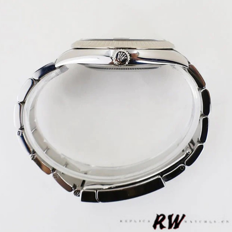 Rolex Datejust 126334 Fluted Bezel Black Diamond Dial 41MM Mens Replica Watch features 41mm a polished Oystersteel stainless steel case, Polished solid white gold fixed fluted bezel. Black dial, 10 diamond hour markers,Date displayed under cyclops lens in window at 3 o'clock with instantaneous date setting. Stop-seconds feature for precise time setting. A scratch resistant sapphire crystal protects the dial.Polished with brushed Oystersteel stainless steel Jubilee bracelet.Folding Oysterclasp deployment buckle with Easylink comfort extension link.