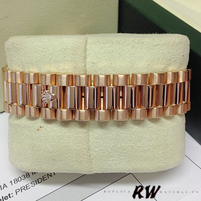Rolex Day-Date 118205 Dark Mother of Pearl Black Dial 36mm Unisex Replica Watch. This classic 36mm Everose gold model featuring a stunning black Mother of Pearl diamond dot dial housing an external Cyclops date aperture at 3 O'clock and a day aperture in-between 11 and 1 O'clock. The dial is surrounded by a rose gold domed bezel, polished finish shoulders and case sides on a rose gold Rolex president bracelet.