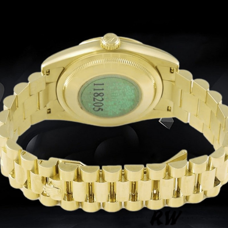 Rolex Day-Date 118208 Black Diamond Dial 36mm Unisex Replica Watch. 36mm yellow gold case with a yellow gold president bracelet. Fixed domed yellow gold bezel. Black dial with gold-tone hands and Diamonds numeral hour markers. Minute markers around the outer rim. Date display at the 3 o'clock position. Day of the week display centered on the 12 o'clock position.Scratch resistant sapphire crystal. Screw down crown. Solid case back. Round case shape. Hidden fold over clasp.