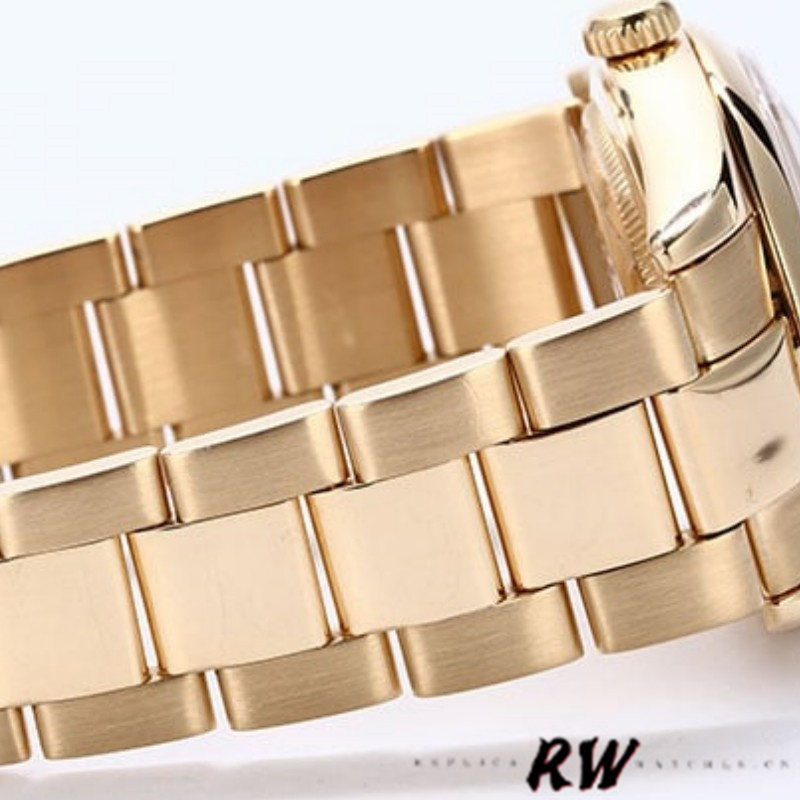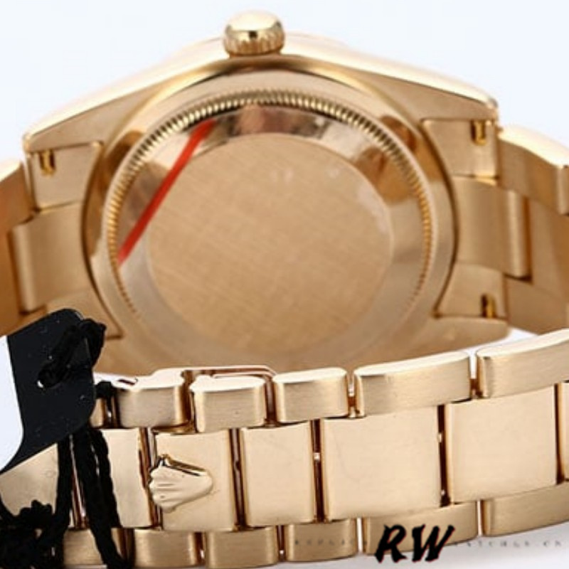 Rolex Day-Date 118208 Black Mother of Pearl Diamond Dial 36mm Unisex Replica Watch .36mm yellow gold case with a yellow gold Rolex president bracelet. Fixed domed yellow gold bezel. Black Mother of pearl dial with gold-tone hands and Diamonds numeral hour markers. Minute markers around the outer rim.Date display at the 3 o'clock position. Day of the week display centered on the 12 o'clock position. Scratch resistant sapphire crystal. Screw down crown. Solid case back. Round case shape.