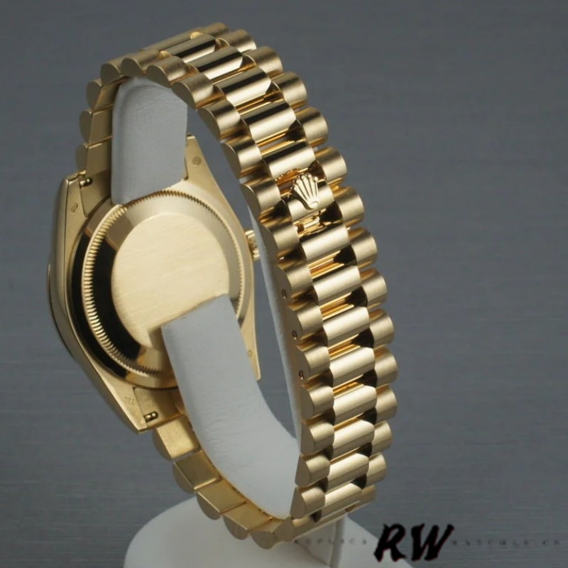 Rolex Day-Date 118208 White Roman Dial Roman Numerals 36mm Unisex Replica Watch has a Yellow Gold 36 mm Round Case with Screw Down Crown and a Yellow Gold Bezel. White Dial with Roman Numerals.Minute markers around the outer rim. Scratch resistant sapphire crystal. Screw down crown. Solid case back. Round case shape. The reliable Rolex Yellow Gold Oyster Bracelet will look great on your wrist.