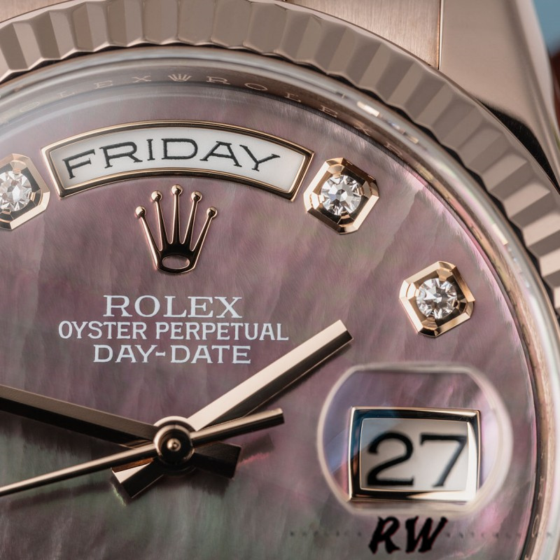 Rolex Day-Date 118235 MOP Black Dial 36mm Unisex Replica Watch. 36mm everose gold case with a everose gold president bracelet. Fixed - fluted everose gold bezel. The Tahitian mother of pearl Roman numeral dial.set with 10 diamonds.Date display at 3 o'clock; day display at 12 o'clock. Scratch resistant sapphire crystal. Screw down crown. Solid case back.