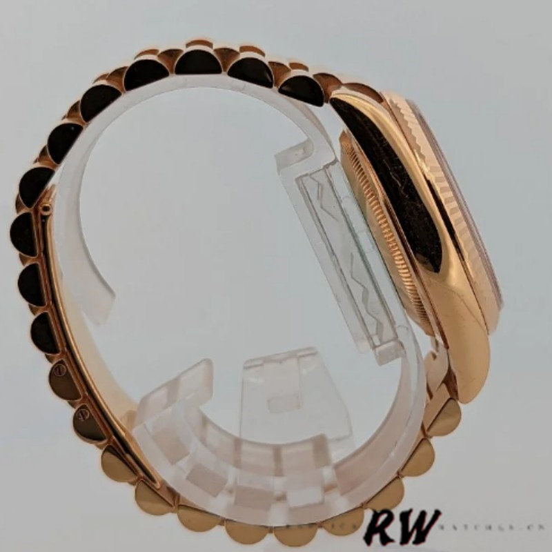 Rolex Day-Date 118235 Pink Roman Numeral dial 36mm Lady Replica Watch has a Rose Gold 36 mm Round Case with Screw Down Crown and a Rose Gold Fluted Bezel. Pink Roman Dial with the day at the 12 o'clock and the date at the 3 o'clock.Rose Gold President Bracelet with the heavy band Folding Crownclasp.