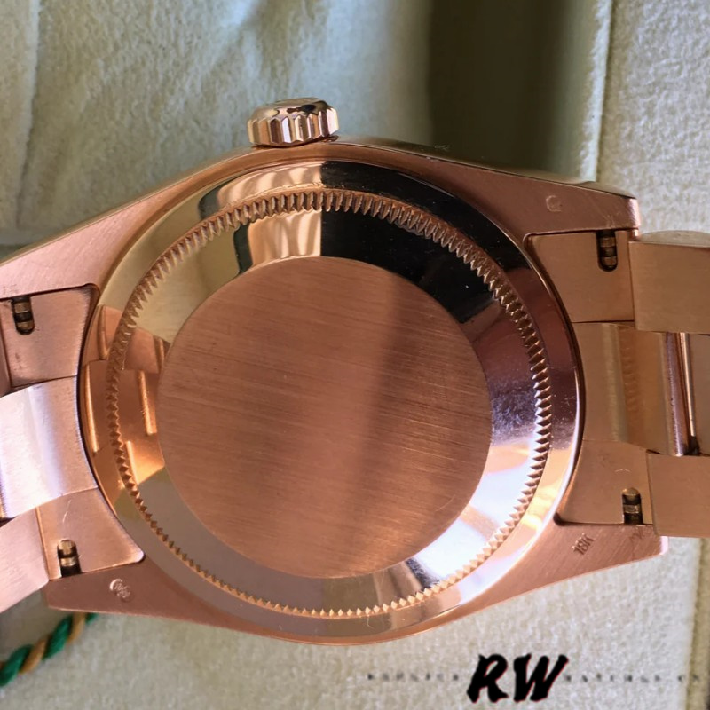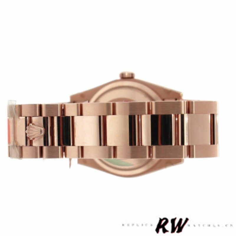 Rolex Day-Date 118235 Rhodium Grey Dial 36mm Unisex Replica Watch has a Rose Gold 36 mm Round Case with Screw Down Crown and a Rose Gold Fluted Bezel. Rhodium Grey Dial with Index Dial Markers with the day at the 12 o'clock and the date at the 3 o'clock.Rose Gold President Bracelet with the heavy band Folding Crownclasp.