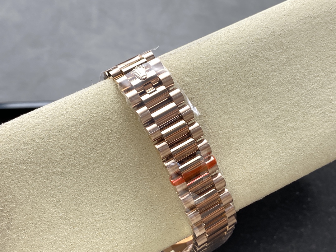 Rolex Day-Date 118235 Rose Gold Chocolate Brown Dial 36mm Unisex Replica Watch has a Rose Gold 36 mm Round Case with Screw Down Crown and a Rose Gold Fluted Bezel. This beautiful time piece features a chocolate Dial.8 diamonds and 2 baguette-cut rubies dial with Index Dial Markers. The reliable Rolex Rose Gold President Bracelet will look great on your wrist.