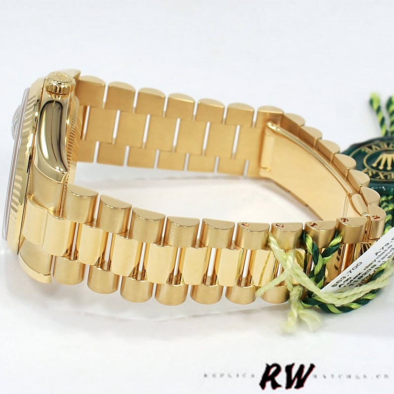 Rolex Day Date 118238 Black Diamond Dial Fluted Bezel 36mm Mens Replica Watch.36mm yellow gold Case and Fluted Bezel. Featuring a black diamond dot and baguette cut ruby dial,Minute markers around the outer rim. Date display at 3 o'clock; day display at 12 o'clock. Scratch resistant sapphire crystal. Screw down crown. Solid case back.Yellow gold President bracelet.