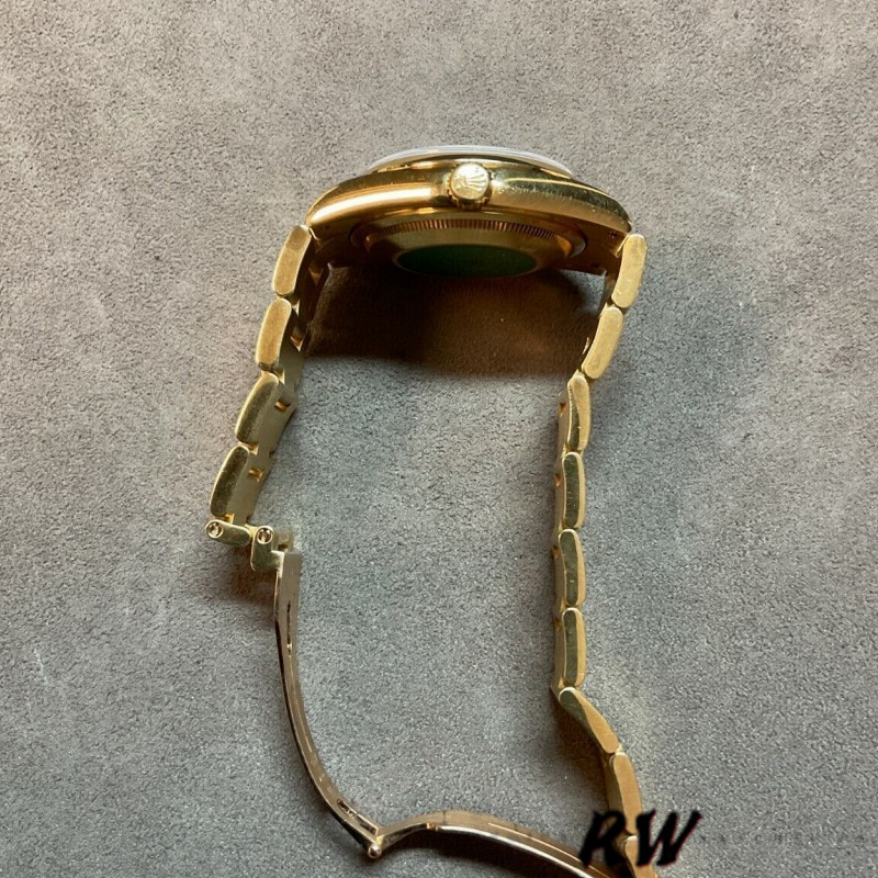 Rolex Day-Date 118238 Dark Mother of Pearl Diamond 36mm Unisex Replica Watch . 36mm yellow gold case with a yellow gold Rolex president bracelet. Fixed domed yellow gold bezel. Dark Mother of Pearl Black Dial with Roman Numerals . Minute markers around the outer rim.Date display at the 3 o'clock position. Day of the week display centered on the 12 o'clock position. Scratch resistant sapphire crystal. Screw down crown. Solid case back. Round case shape.