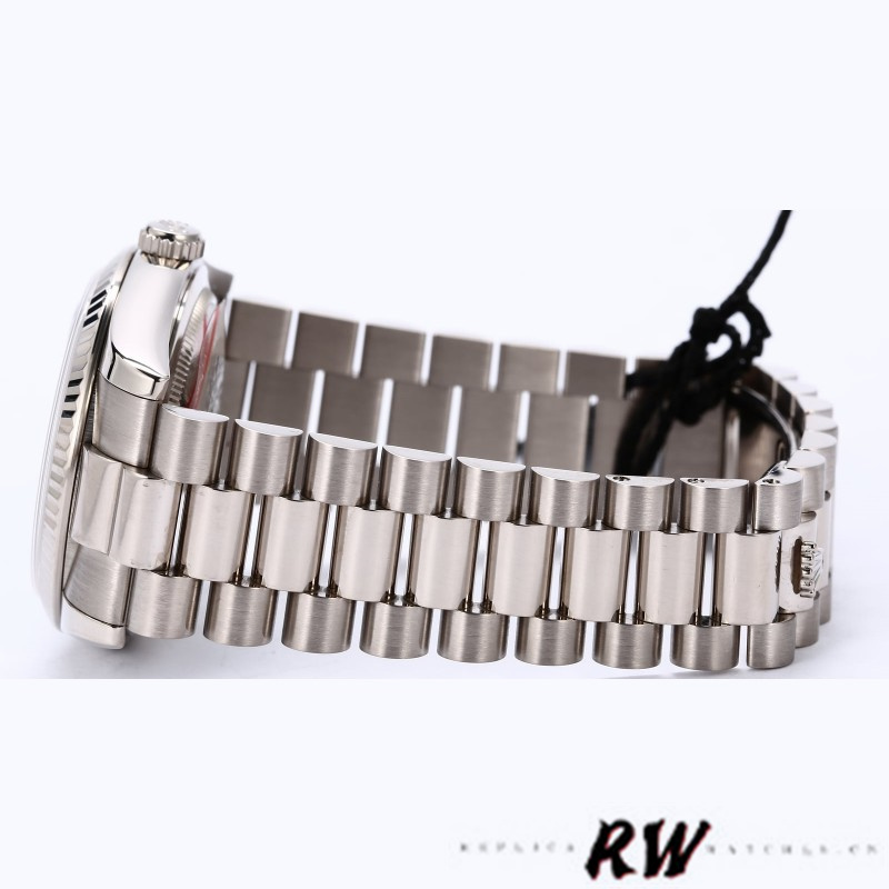 Rolex Day-Date 118239 Black Diamonds Dial Fluted Bezel 36mm Unisex Replica Watch has a 36mm white gold case, an white gold presidential bracelet with crown clasp and an white gold fluted bezel.Black dial with diamond markers.Diamond hour markers (2 baguettes at 6 and 9 o'clock) day display at 12 o'clock, date display at 3 o'clock from the nineties,scratch-resistant sapphire crystal.