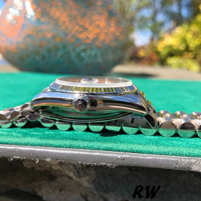 Rolex Day-Date 118239 Silver Roman Numeral 36mm Unisex Replica Watch.36mm white gold case with a white gold Rolex Oyster bracelet. Fixed - fluted White gold bezel.Silver Dial with Roman Numerals.Day of the week window displayed at the 12 o'clock position.Date window displayed at the 3 o'clock position with a cyclops magnifying lens.Scratch resistant sapphire crystal. Screw down crown.