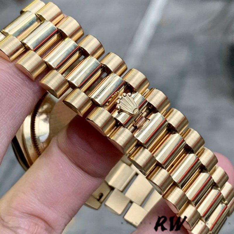 Rolex Day-Date 118388 Bull's Eye Brown Dial 36mm Unisex Replica Watch features a 36mm Diamond set yellow gold case fitted with Bull's Eye Brown Dial Set with Diamonds, Diamond-encrusted lugs, a matching diamond bezel, hour and minute hands, Scratch resistant sapphire crystal with cyclops magnifier. Day of the week window displayed at the 12 o'clock position.Date window displayed at the 3 o'clock position.The elegantly designed with Concealed Folding Crownclasp will look great on your wrist.