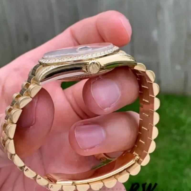 Rolex Day-Date 118388 Diamond Dezel Green Index Dial 36MM Unisex Replica Watch features a 36mm Diamond set yellow gold case fitted with Green Dial Index Hour Markers, Diamond-encrusted lugs, a matching diamond bezel, hour and minute hands, Scratch resistant sapphire crystal with cyclops magnifier. Day of the week window displayed at the 12 o'clock position.Date window displayed at the 3 o'clock position.The elegantly designed with Concealed Folding Crownclasp will look great on your wrist.