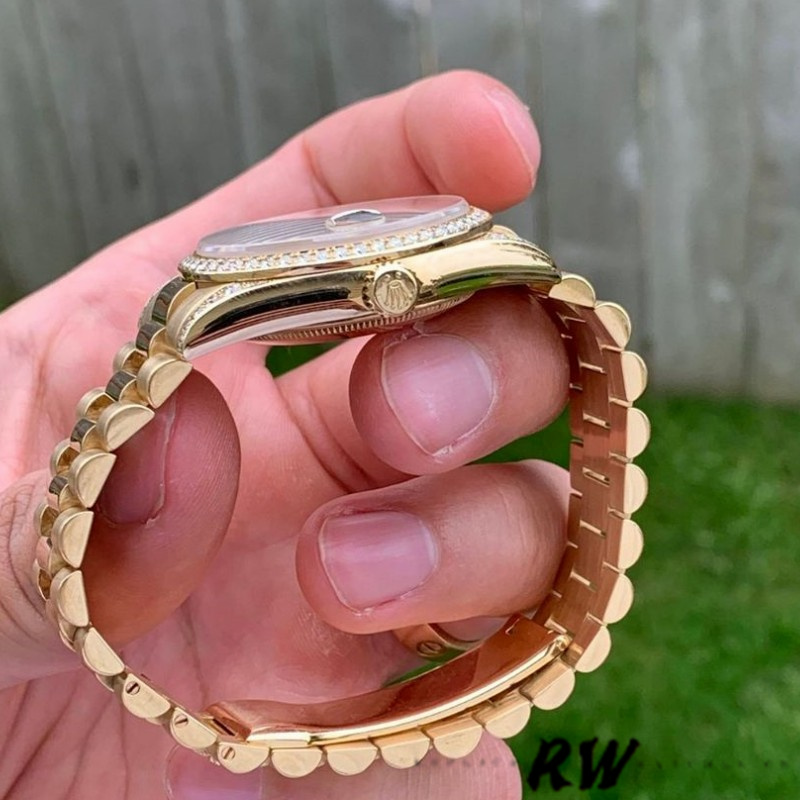 Rolex Day-Date 118388 yellow gold Black Diamond Dial 36mm Unisex Replica Watch features a 36mm Diamond set yellow gold case fitted with a diamond set black dial, Diamond-encrusted lugs, a matching diamond bezel, Scratch resistant sapphire crystal with cyclops magnifier. Day of the week window displayed at the 12 o'clock position.Date window displayed at the 3 o'clock position.The elegantly designed with Concealed Folding Crownclasp will look great on your wrist.