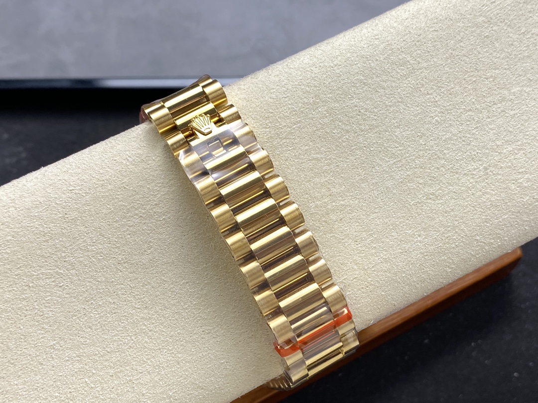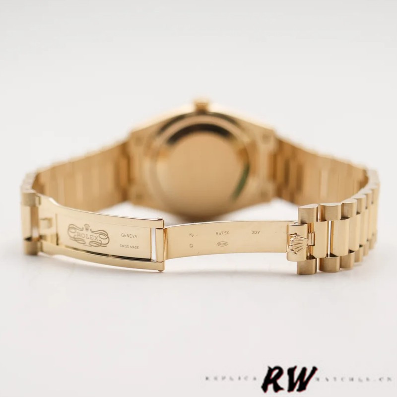 Rolex Day-Date 128238 Fluted Bezel Turquoise Diamond Dial 36MM Unisex Replica Watch,36mm yellow gold case, screw-down back, screw-down crown with twinlock double waterproofness system, fluted bezel, Turquoise dial with index and Roman numeral diamond hour markers. Date window displayed under cyclops lens at 3 o'clock. Day window displayed at 12 o'clock. Instantaneous day and date setting.Yellow gold President bracelet with semi-circular three-piece links, concealed folding Crownclasp buckle.