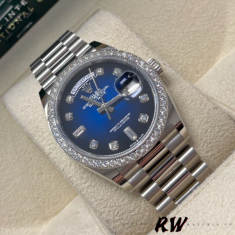 Rolex Day-Date 128349RBR Blue Ombre Dial Diamond Bezel 36MM Unisex Replica Watch,36mm white gold case, screw-down back, screw-down crown with twinlock double waterproofness system, bezel set with diamonds, Blue Ombre dial with diamond hour markers. Day window displayed at 12 o'clock. Date window displayed under cyclops lens at 3 o'clock,White gold President bracelet with semi-circular three-piece links, concealed folding Crownclasp buckle.