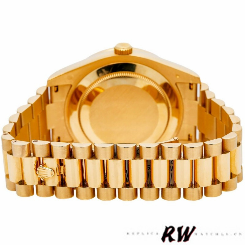 Rolex Day-Date 218348 Champagne Diamonds Dial 41MM Mens Replica Watch,has a 41mm Yellow gold case that has a solid case back with Screw Down Crown and Diamonds Bezel.Scratch resistant sapphire crystal with Cyclops magnifier.Champagne Dial with Diamonds Hour Markers,Date Window Displayed at 3 O'Clock,Day Window Displayed at 12 O'Clock,Yellow gold three-piece-link Presidential bracelet with a fold-over clasp.