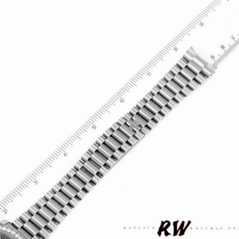 Rolex Day-Date 218349 Wave Blue Dial 41MM Mens Replica Watch,has a 41mm white gold case that has a solid case back with Screw Down Crown and Diamonds Bezel.Scratch resistant sapphire crystal with Cyclops magnifier.Wave Blue Dial with Arabic Numerals Hour Markers,Date Window Displayed at 3 O'Clock,Day Window Displayed at 12 O'Clock,White gold three-piece-link Presidential bracelet with a fold-over clasp.