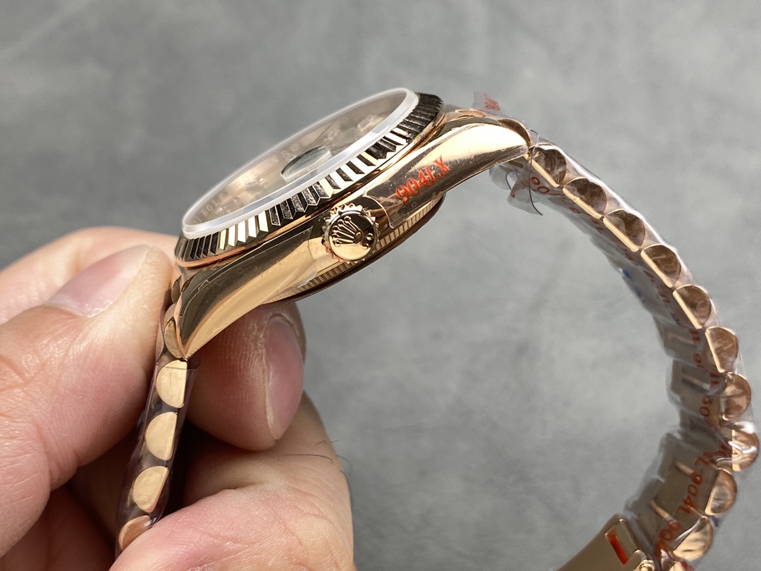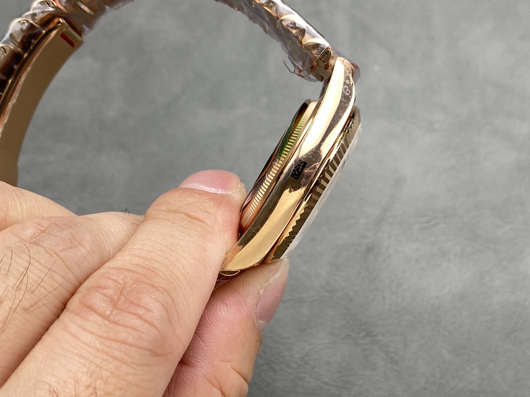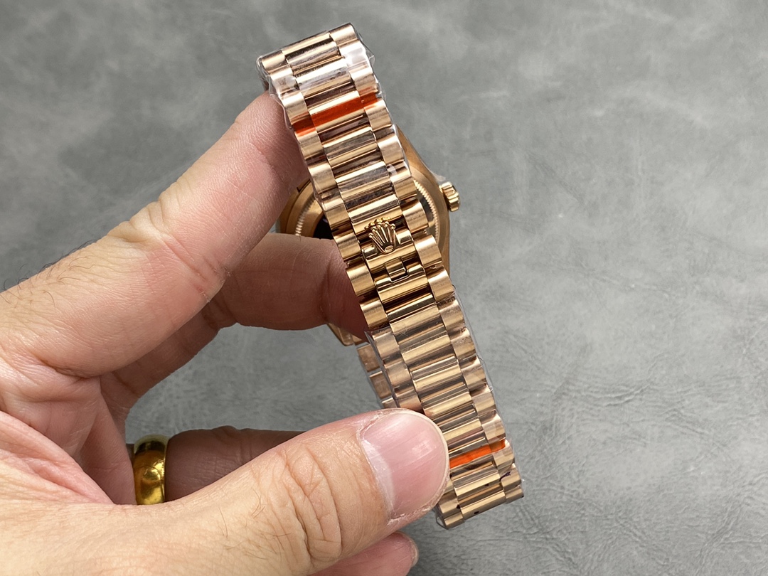 Rolex Day-Date 228235 Sundust Index Dial Fluted Bezel 40mm Mens Replica Watch, featuring a 40mm Everose Gold case, solid case back with screw-down crown and fluted bezel. Scratch-resistant sapphire crystal with Cyclops magnifying glass.Sundust Dial with Index hour markers, date window at 3 o'clock, day of the week window at 12 o'clock, Everose Gold three-piece presidential bracelet with deployant clasp.