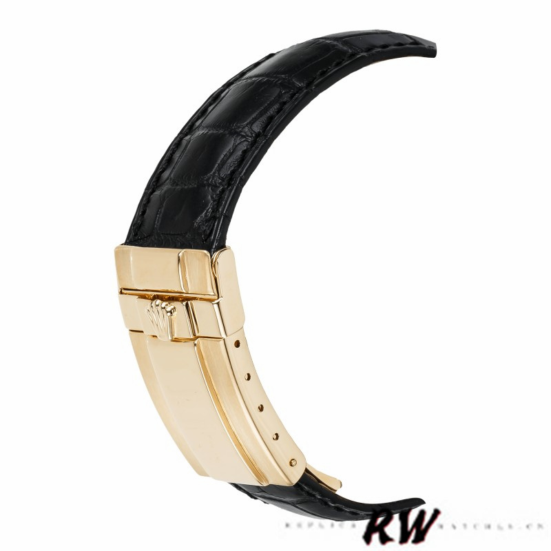 Rolex Daytona 116518 Black Leather Strap White Dial 40mm Mens Replica Watch.40.0 mm yellow gold case in diameter.yellow gold tachymeter engraved bezel. Scratch resistant sapphire crystal. White dial with arabic numerals. Small seconds hand at 6 o'clock. Centre chronograph hand, 30-minute counter at 3 o'clock and 12-hour counter at 9 o'clock. Black leather strap with yellow gold deployent buckle.