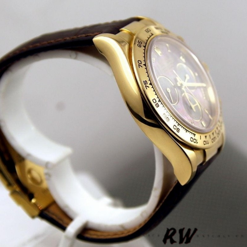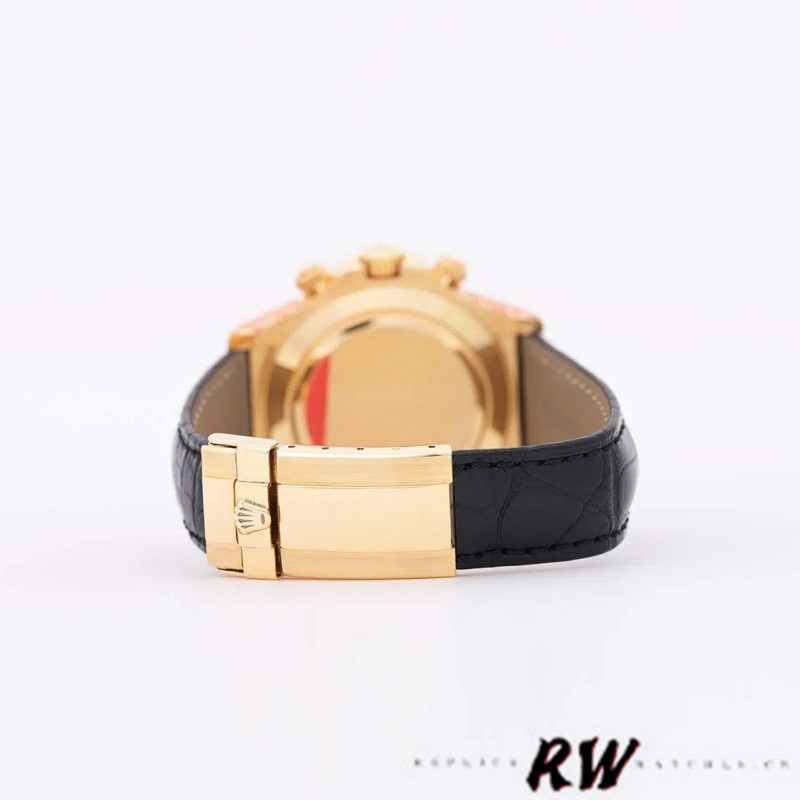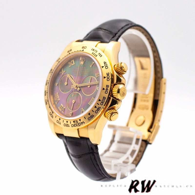 Rolex Daytona 116518 Black MOP Roman Dial 40mm Mens Replica Watch.40mm yellow gold case.Black Mother of Pearl yellow gold Roman markers; 3 sub-dials. Yellow gold Roman numeral hours markers and hands, a polished yellow gold finish, and a supple leather strap bracelet secured by a folding Oysterlock clasp. While this gold Rolex is luxurious in design, it's also incredibly resilient. The case is topped with a scratch-resistant sapphire crystal.