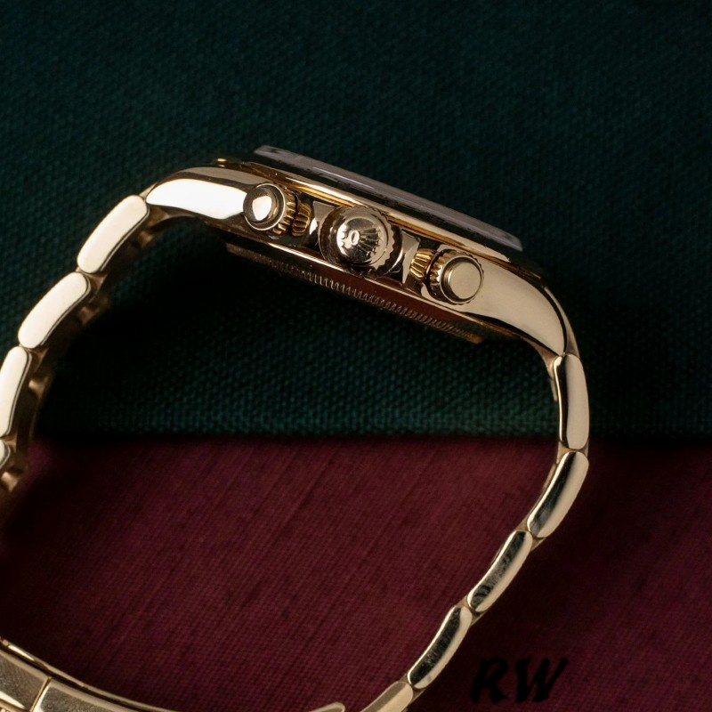 Rolex Daytona 116528 Mother of Pearl Dial 40mm Mens Replica Watch.40mm yellow gold case in diameter with screw-down Triplock winding crown and screw-down pushbuttons, protective crown guard, polished yellow gold tachymeter engraved bezel,Yellow gold Oyster bracelet with Oysterlock clasp, The Mother of Pearl dial has a lovely milky hue and sports applied yellow-gold Arabic numerals hour markers, scratch-resistant sapphire crystal,It gives this sporty chronograph an almost dreamlike quality.