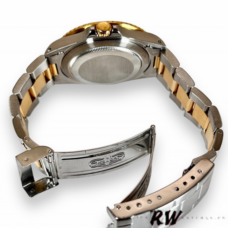 Rolex GMT-Master II 16713 White Gold Chocolate Dial 40mm Mens Replica Watch features a stainless steel case with yellow gold bezel that has a brown and gold bezel insert.The brown dial displayed the date window under a cyclops lens at 3 o'clock and feature a GMT second time zone feature that is indicated by the arrow-tipped hand. White gold Oyster bracelet with flat three-piece links and folding clasp.
