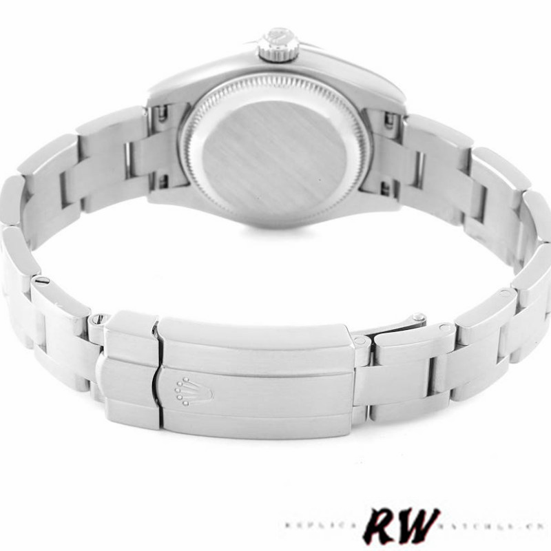 Rolex Oyster Perpetual 176200 Blue Dial Domed Bezel 26mm Lady Replica Watch, 26MM Stainless steel oyster case in diameter. Stainless steel smooth domed bezel. Scratch resistant sapphire crystal. Blue Dial with Arabic Numeral and Index Hour Markers.Stainless steel oyster bracelet with a fold over clasp.