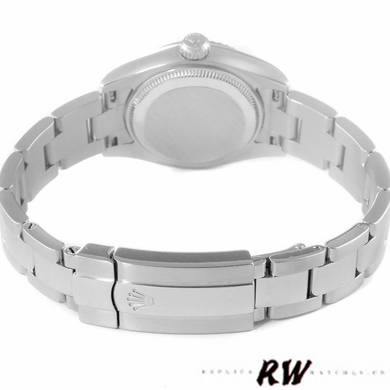 Rolex Oyster Perpetual 176234 Black Roman and Diamond Dial 26MM Lady Replica Watch,26MM Stainless steel oyster case in diameter.White gold fluted bezel. Scratch resistant sapphire crystal. Black dial with roman numerals and diamond hour markers. Stainless steel oyster bracelet with a deployant buckle.