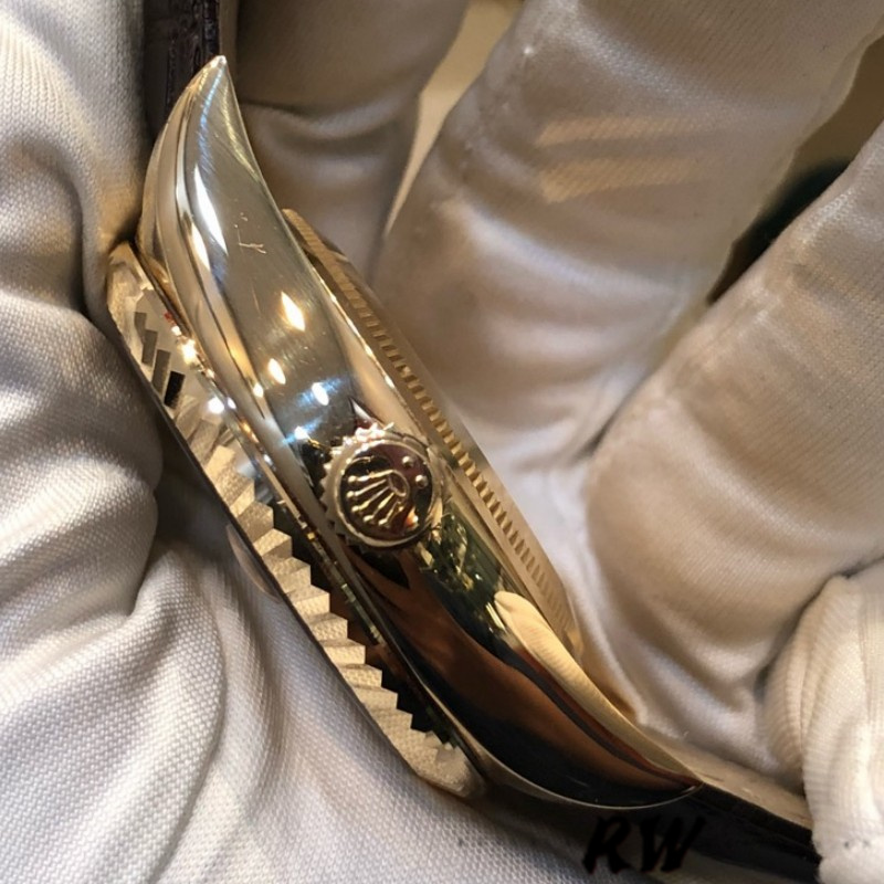 Rolex Sky-Dweller 326138 Champagne Arabic Dial Yellow Gold 42MM Mens Replica Watch ,42mm yellow gold case, bidirectional rotatable ring command fluted bezel , champagne dial, Arabic numerals, Second time-zone displayed via off-center rotating disc, Saros annual calendar with date at 3 o'clock and month indicated in discrete apertures at each of the 12 hour marks, Alligator leather strap with Yellow gold folding Oysterclasp.