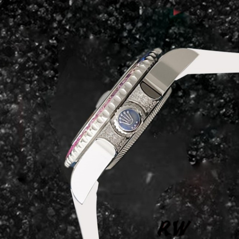 Rolex Submariner 116610 Black Dial White Rubber strap 40mm Mens Replica Watch has a Stainless Steel 40 mm Round Case ,The black dial with dot and index hour markers .Minute markers around the outer rim.Rainbow diamond bezel,Round diamonds are fitted on the lugs for an extra touch of luxury. Numerals Date window with magnifying bubble at 3 o'clock, Sapphire Crystal,White Leather strap made from flexible metal blades overmoulded with high-performance elastomer, Folding safety buckle with rapid extension system.