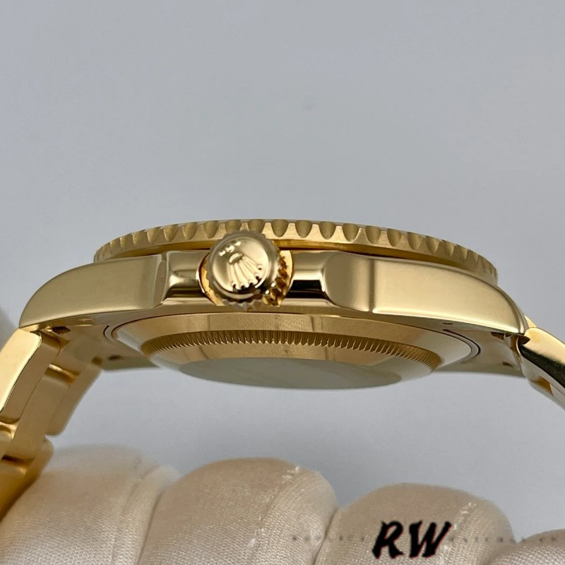 Rolex Submariner Date 116618LN Black Dial 40mm Mens Replica Watch. 40mm yellow gold case, screw-down crown with triplock triple waterproofness system, unidirectional rotatable bezel with black Cerachrom insert and gold coated numerals and graduations, scratch-resistant sapphire crystal with cyclops lens over the date, black dial, hour markers lumed in brilliant blue chromalight and a beefy Oyster bracelet with the glidelock system.