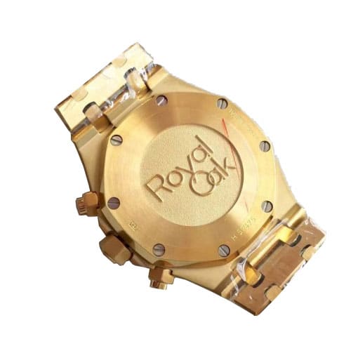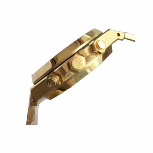 The Royal Oak AP Replica is a striking watch from Audemars Piguet’s Royal Oak Chronogaph family. It features a 2236 Automatic movement with a 60-hour power reserve and precision within COSC certification limits. The case is made of 904L stainless steel with a yellow gold color, and the bezel is also made of 904L stainless steel with a matching yellow gold color. The crystal is sapphire and the size is 41.00 mm with a thickness of 15.00 mm. The bracelet is also 904L stainless steel with a Royal Oak design and adjustable links. The dial is black with stick and dot indices, and the hour markers and hands are made of 904L stainless steel.