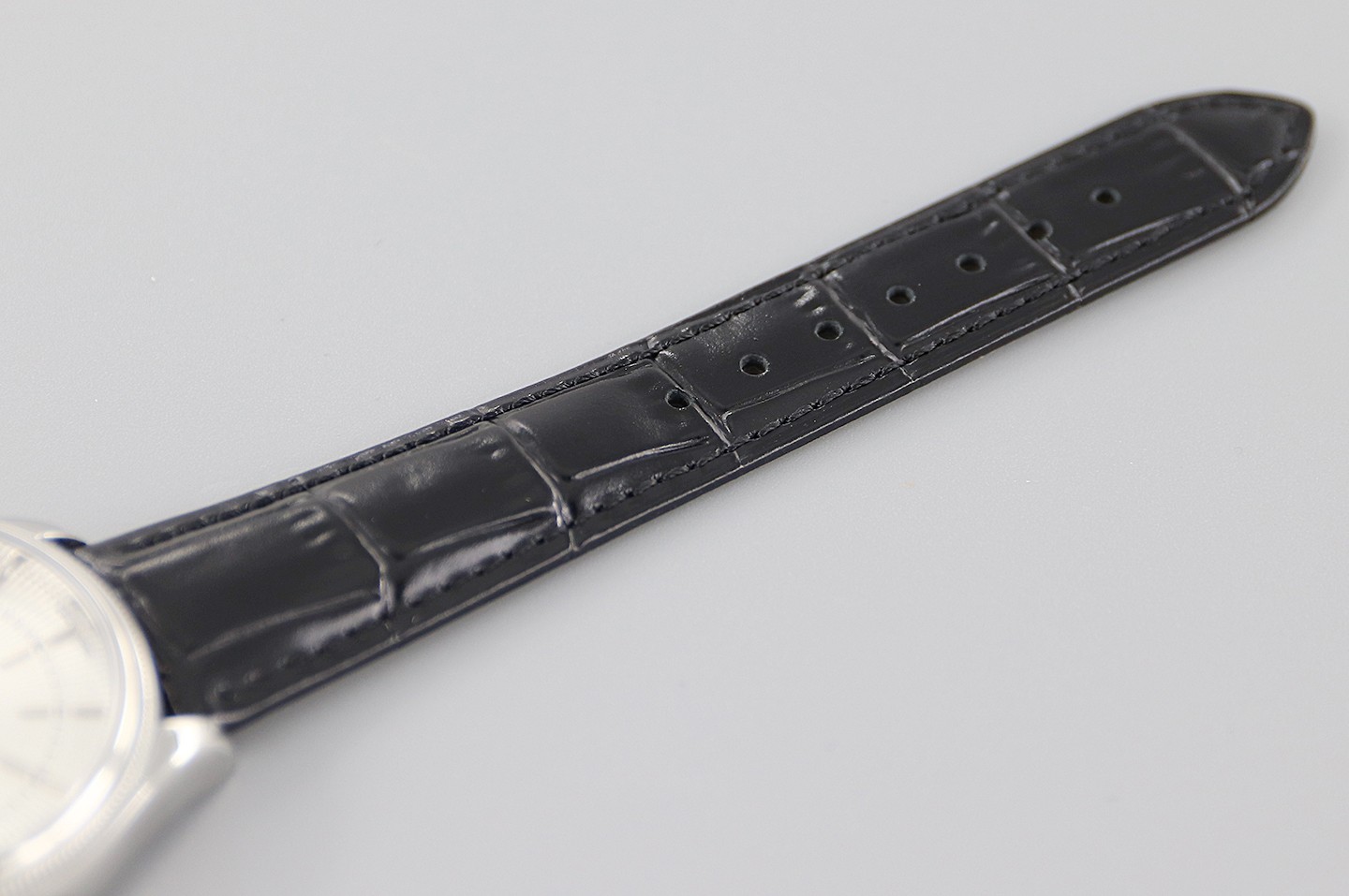 Rolex Cellini Date 50519 Black Leather Silver Dial 39mm Mens Replica Watch has a white Gold 39 mm Round Case with Screw Down Crown and a White Gold Bezel.Scratch resistant sapphire crystal.Silver sunburst guilloche dial with raised polished baton hour markers. Fine printed minute/seconds track. Date subdial at 3 o''clock aperture. Black Leather Bracelet will look great on your wrist with white gold tang buckle.