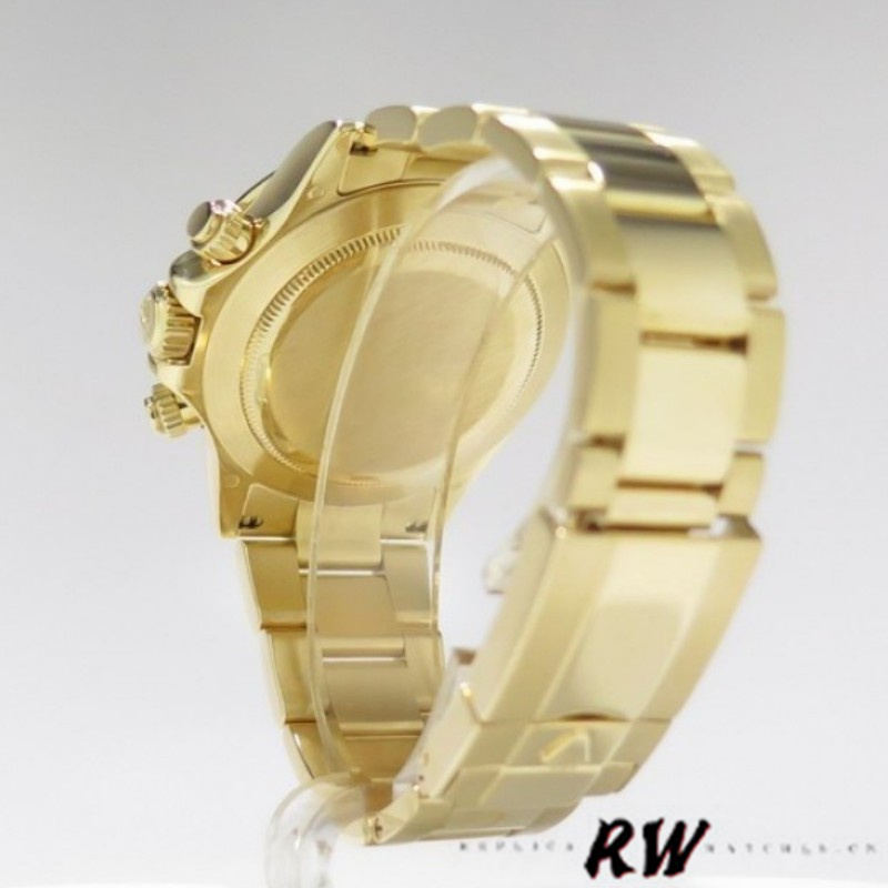 Rolex Cosmograph Daytona 116528 Black MOP Roman Dial 40MM Mens Replica Watch,40mm yellow gold case in diameter. Yellow gold tachymeter engraved bezel. Scratch resistant sapphire crystal. Black Mother of Pearl Dial with Roman Numeral Hour Markers.Outer 1/5th seconds track. Three Gold outlined subsidiary dials for the seconds, the 12-hour and 30-minute registers. Luminous yellow gold baton hands.Yellow gold oyster bracelet with flip-lock clasp.
