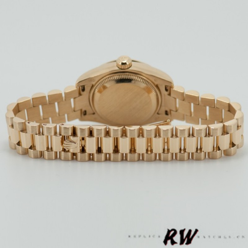Rolex Datejust 179138 Champagne Jubilee Dial 26MM Lady Replica Watch featuring yellow gold oyster case 26mm in diameter.Yellow gold diamond bezel. Scratch resistant sapphire crystal with Cyclops magnifier.Champagne Jubilee dial with diamond hour markers.Date calendar at 3 o'clock aperture. Yellow gold president bracelet with hidden clasp.