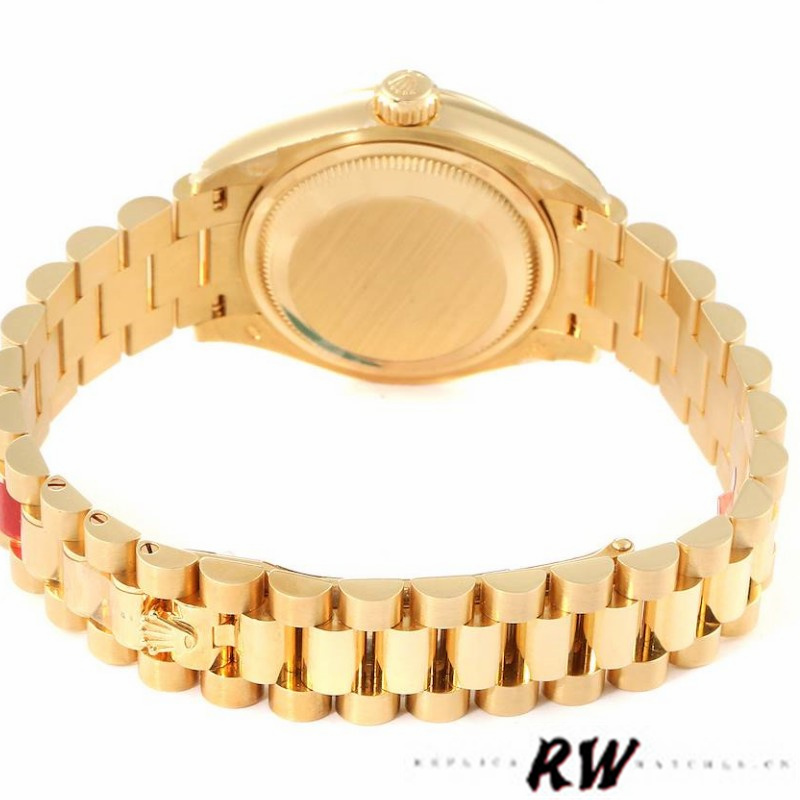 Rolex Datejust 279178 White Roman Dial Fluted Bezel 28mm Lady Replica Watch, has a yellow gold 28 mm Round Case with Screw Down Crown and a yellow gold Fluted Bezel.White dial with Roman Numeral hour marker. Date Window Displayed at 3 O'Clock,Yellow gold President bracelet with semi-circular three-piece links, concealed folding Crownclasp buckle.